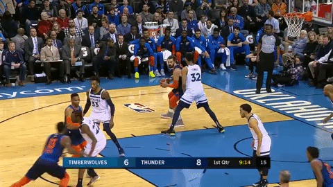 Steven Adams didn’t necessarily light it up on the stat sheet on Sunday night, but his presence through his physicality and offensive efficiency versus young all-star Karl Anthony Towns was palpable during the course of play. Adams is proving to be an increasingly reliable offensive asset, adding options to this OKC assault. Take a look at Adams footwork as he maneuvers his way to the rim for points against the All-Star.
